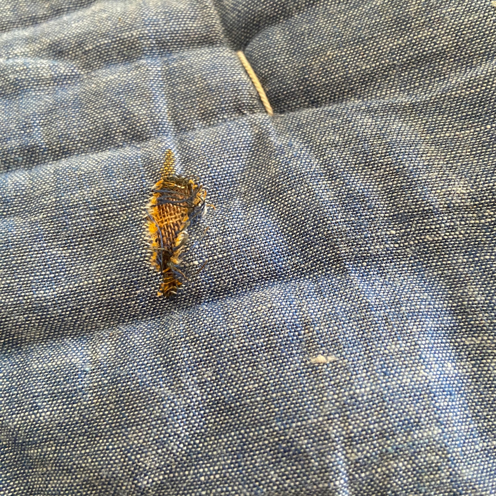 Materials: Floral print cotton feed sack with a chambray denim backing. Entirely hand quilted. Very thick and heavy!