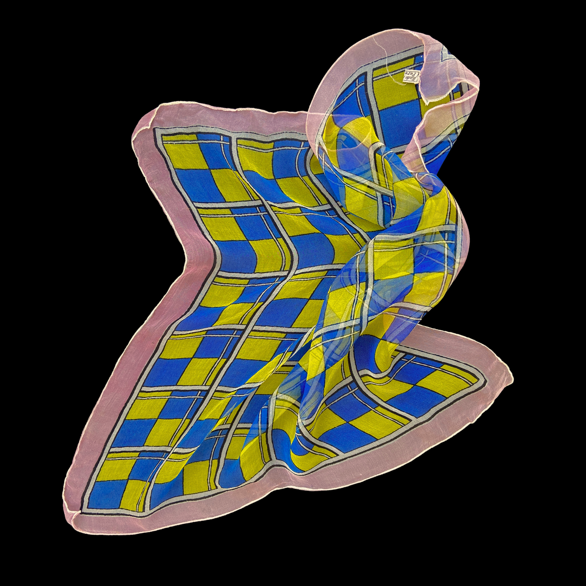 1950s Checkered Silk Scarf Yellow Blue Pink