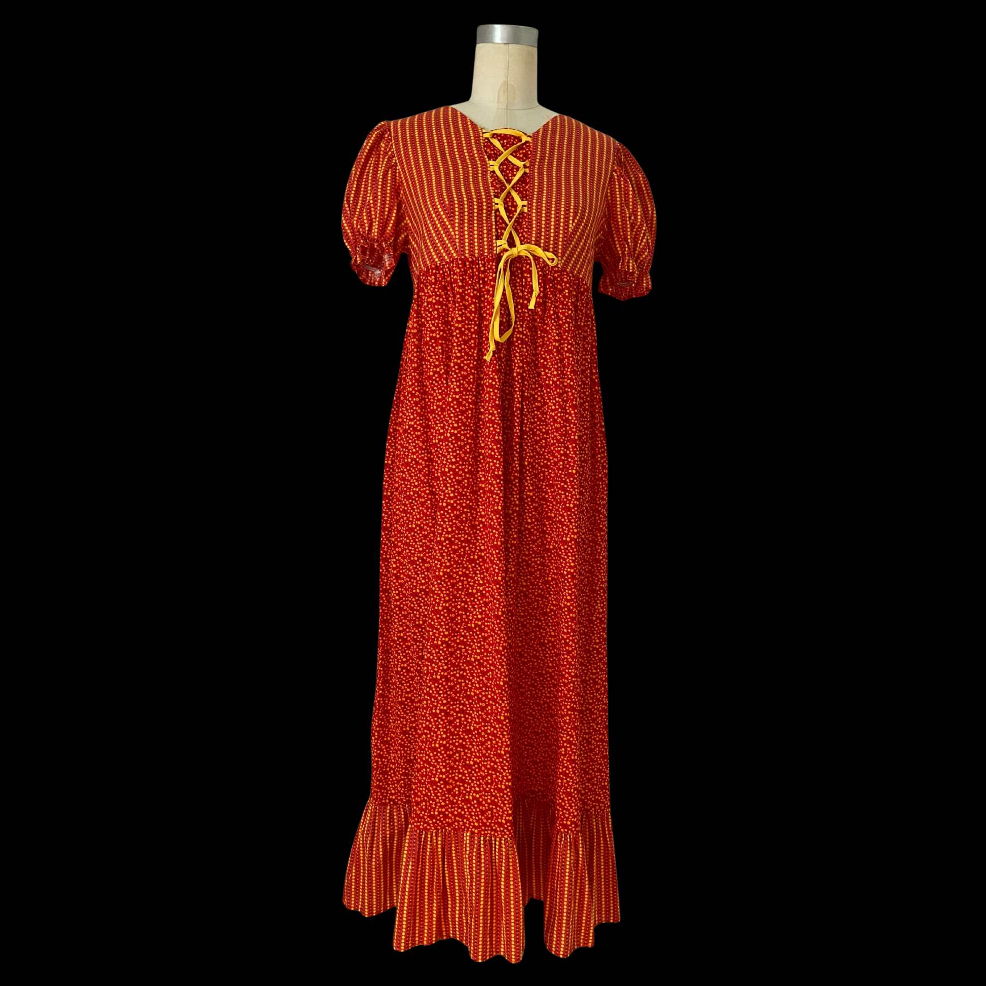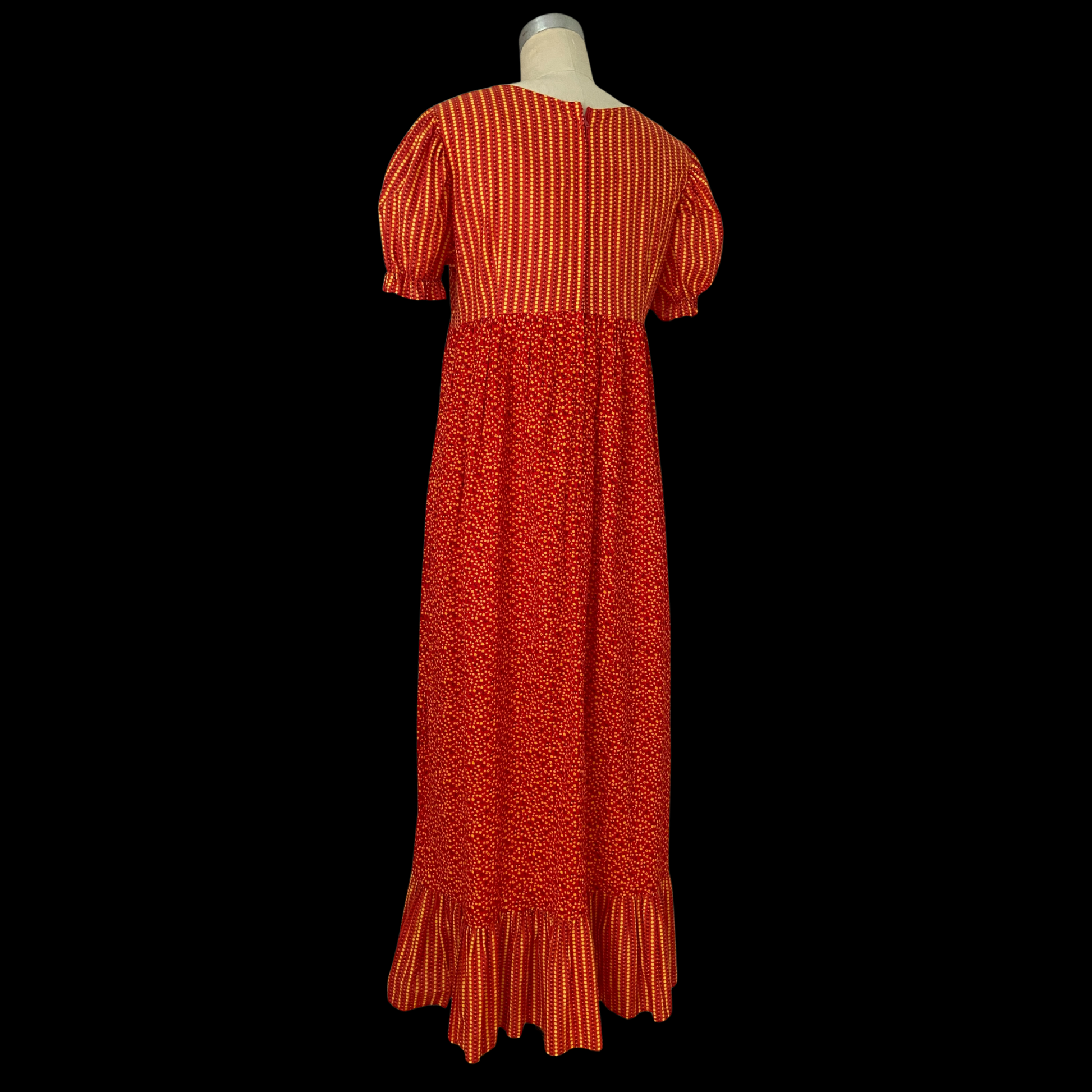 1960s 1970s Prairie Dress Red Floral Cotton Puff Sleeve