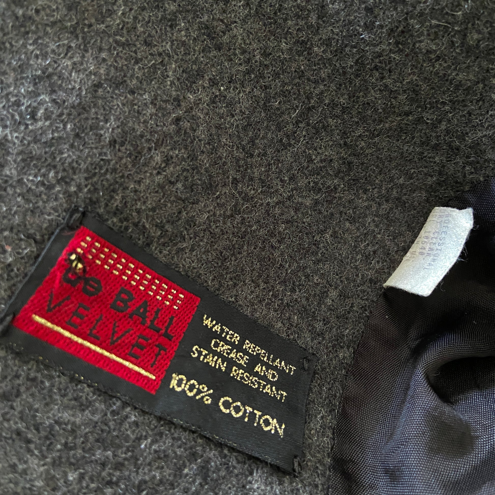 Materials: 80% wool, 20% nylon with 100% cotton velvet trimmings.