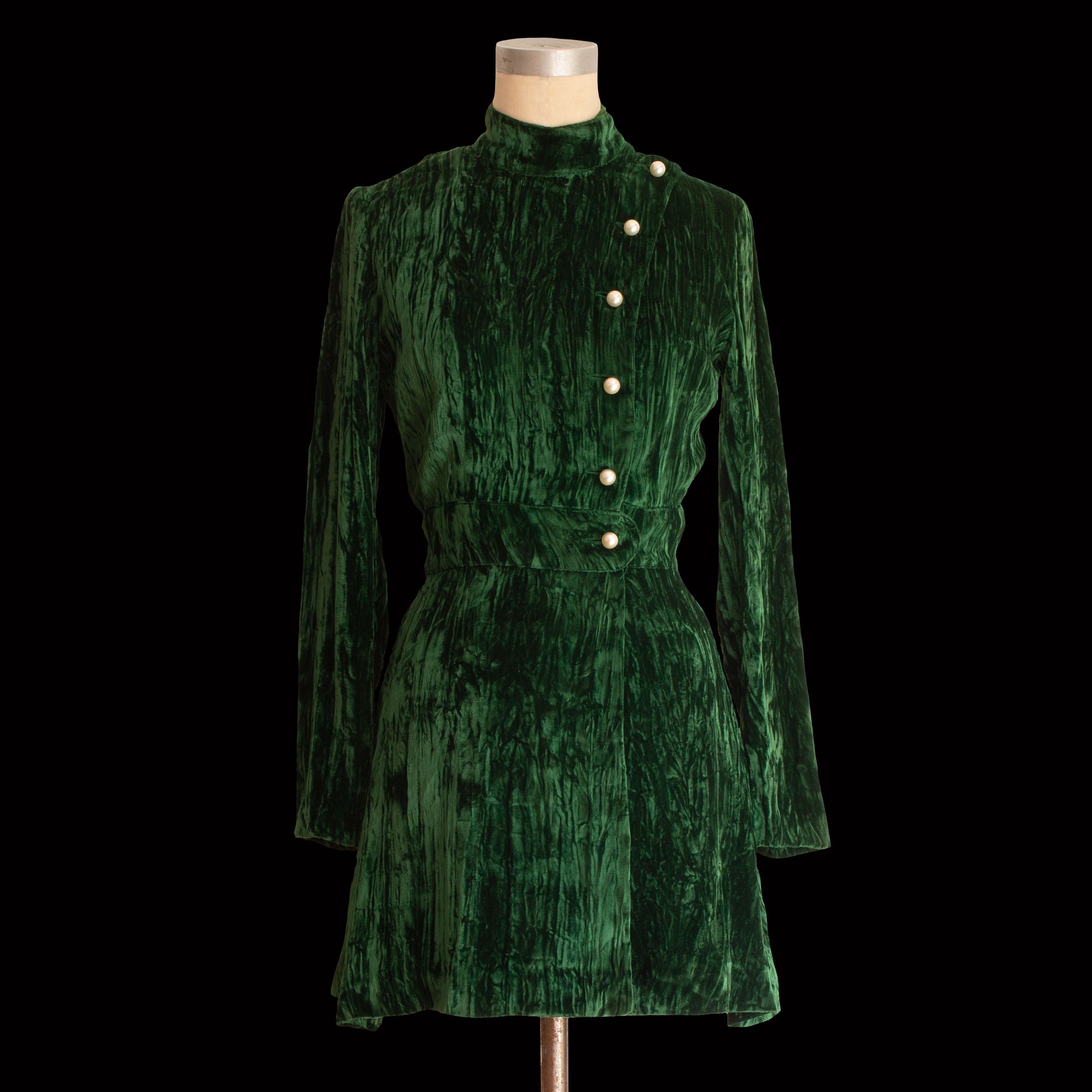 Paraphernalia boutique opened in NYC in 1965 and was a response to the growing youth movement happening in London. Young, up and coming designers such as Betsey Johnson and Michael Mott were employed to create fresh and outlandish fashions to attract a hip crowd. The opening party was hosted by Andy Warhol with the Velvet Underground playing a set. Fans of the boutique included Twiggy and Edie Sedwick. This Michael Mott designed dress is made from a soft crushed cotton velvet in a deep mossy green, with large faux pearls buttoning up the front. Its a fun play on a military silhouette!