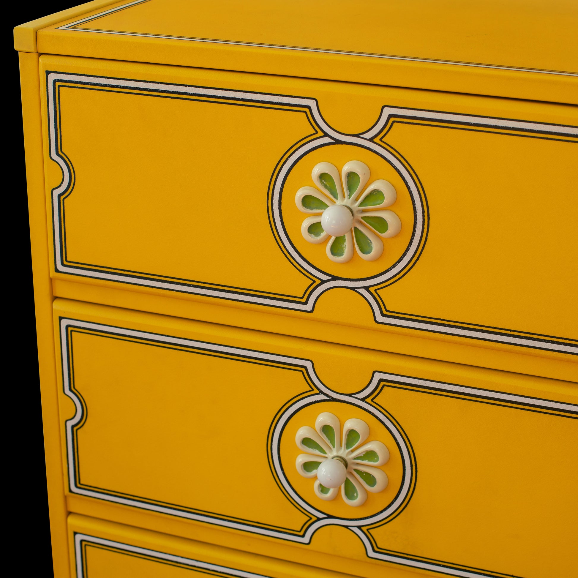 From the Drexel "Plus One" line which was infamously designed by readers of Seventeen Magazine when they were asked what their dream bedroom set would be. They sent in designs and sketches, and a design team compiled them and put the collection together. Drexel collaborated with 3M to enrobe the dressers in vinyl. This dresser is in the yellow color way, there was also a lime green color way available.