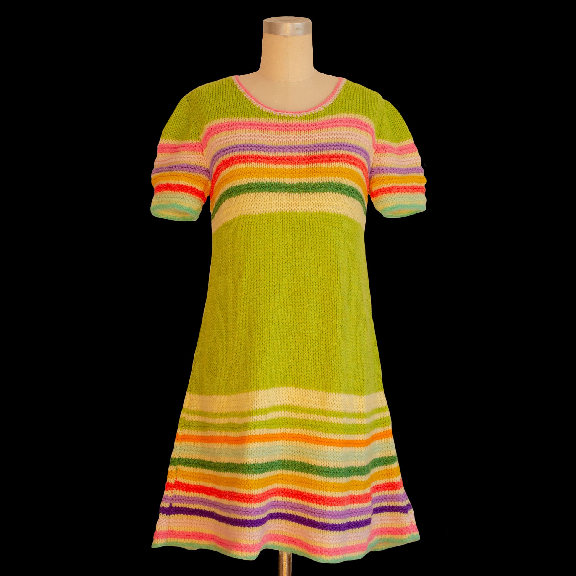 Knitting had a creative explosion in the 1970s, with crafty people wanting to look back on days of yesteryear. Staying true with the time, many outrageous textiles were created, and knitting took a psychedelic turn that had not been seen before the decade. This piece is completely hand knit out of various soft acrylic yarns. The stripes have a ribbed feeling and the yarn includes a variety of textures including fuzzy and sparkly. Maker unknown.
