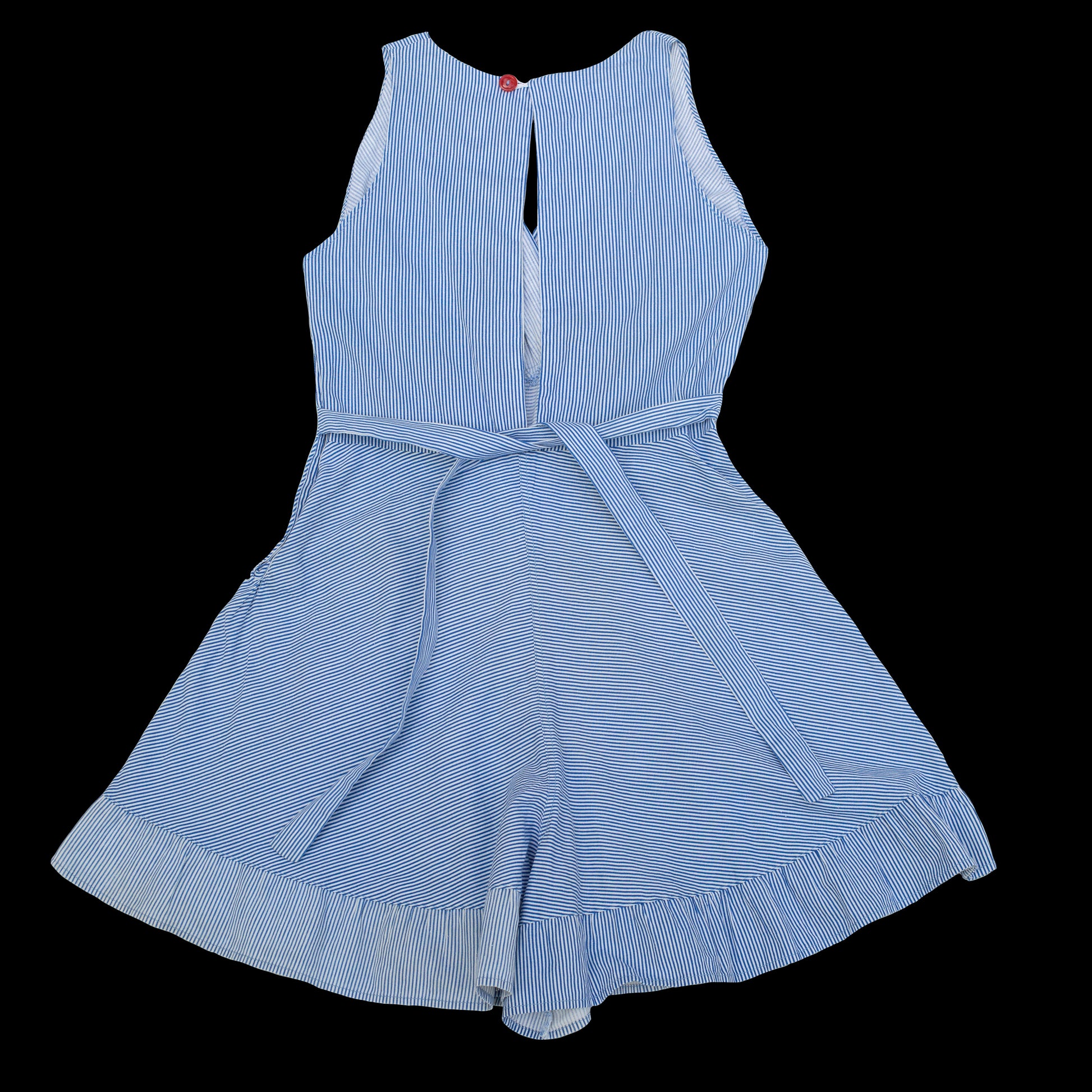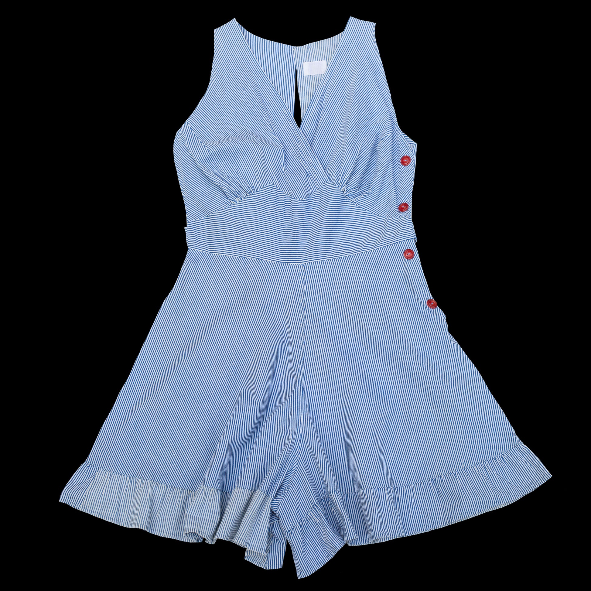 Playsuits became popular fashion in the 1930s, allowing the wearer to comfortably transition to their bathing suit underneath at the ocean, pool, or lake. Sportswear occasions were one of the few socially acceptable times in the 1930s for a woman to wear shorts or pants. This cotton pinstripe romper plays with a nautical design. The shorts are bias cut and the back features a deep keyhole. Maker's tag faded beyond recognition.