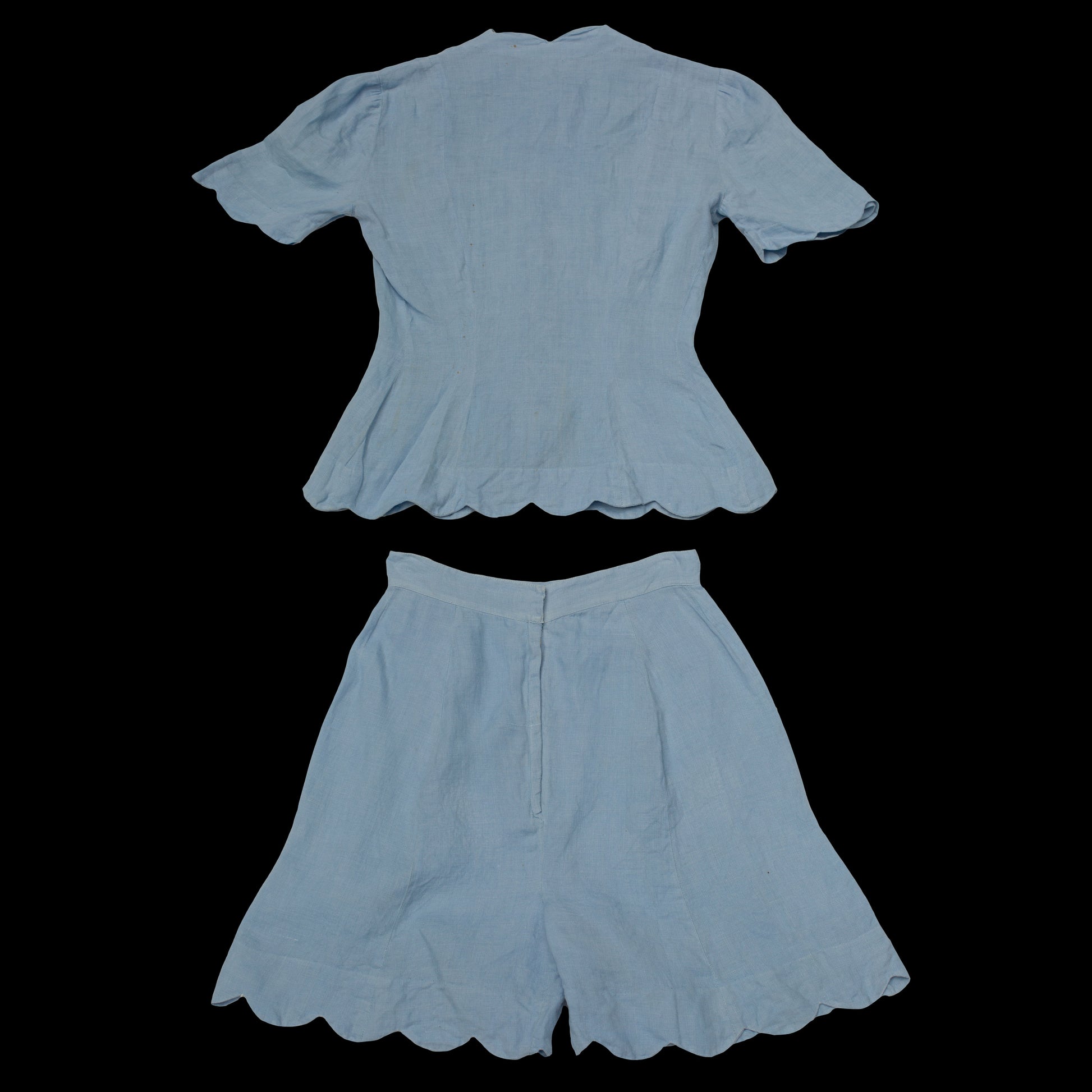 Made from a woven cotton with scalloped edges. The blouse buttons up the front with large carved mother of pearl buttons. shorts zip up the back with a metal zip. The maker was a hospitality major who owned several KFC restaurants in Western North Carolina with her husband. She enjoyed hosting guests at her three store home overlooking Beaver Lake in Asheville. There is an additional set in this online museum that was also made by her.