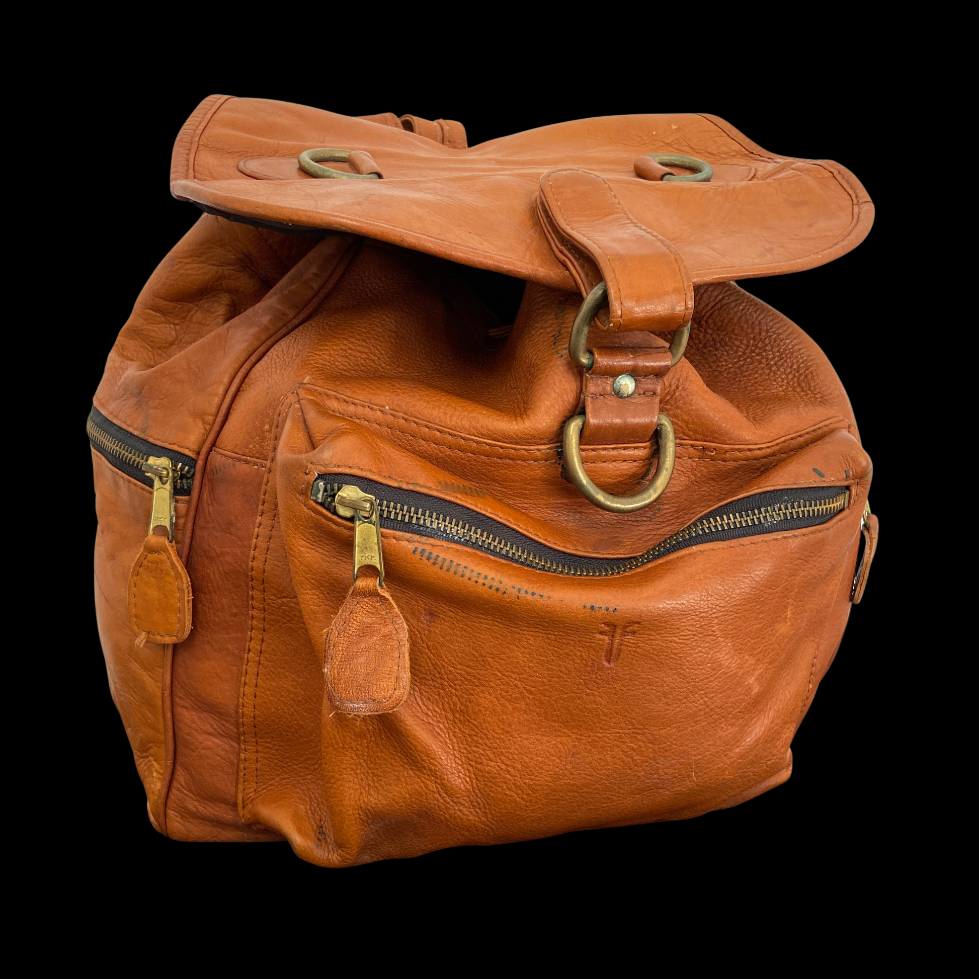 Condition: Distressing and wear throughout. Metal has tarnished areas of the bag from sitting on the leather for a prolonger period. Interior is clean. Still totally functional!